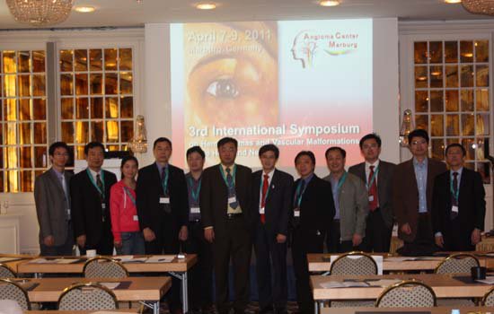 第3届头颈部血管瘤与脉管畸形国际研讨会(The 3rd International Symposium on Hemangiomas and Vascular Malformations of the Head and Neck)在于2011年4月7-10日在德国马堡举行,会议由马堡大学耳鼻咽喉-头颈外科主办,来自美国、德国、法国、意大利、奥地利等国家的近百名专家参加会议,头颈部血管瘤和脉管畸形国际知名专家Suen JY、Waner M、Berlien HP、Grimmer FJ、Richter GT等莅临会议做主题报告。中国大陆赵怡芳、郑家伟、王绪凯、范新东、周国瑜、林晓曦、苏立新、李吉辰、王锡明等14名代表出席研讨会,并分别做了发言交流。郑家伟教授同时应邀担任大会主持人。几位专家的发言题目分别是:Treatment of head and neck life-threatening hemangiomas in children with interferon-alpha(郑家伟),Functional interplay between HF-1 alpha regulates hypoxia-induced autophagy in the progression of infantile hemangiomas and vascular malformations(赵怡芳、陈刚),Photodynamic therapy of vascular malformations of the head and neck (周国瑜) ,Reconstructive options after resection of extensive arteriovenous malformations (林晓曦),Effect of electrochemical therapy in treating fast draining venous malformations in the maxillofacial region (王绪凯),Ethanol embolisation of av-malformations in the tongue and floor of the mouth (范新东)和Absolute ethanol embolisation of arteriovenous malformations in periorbital region (苏立新)。
